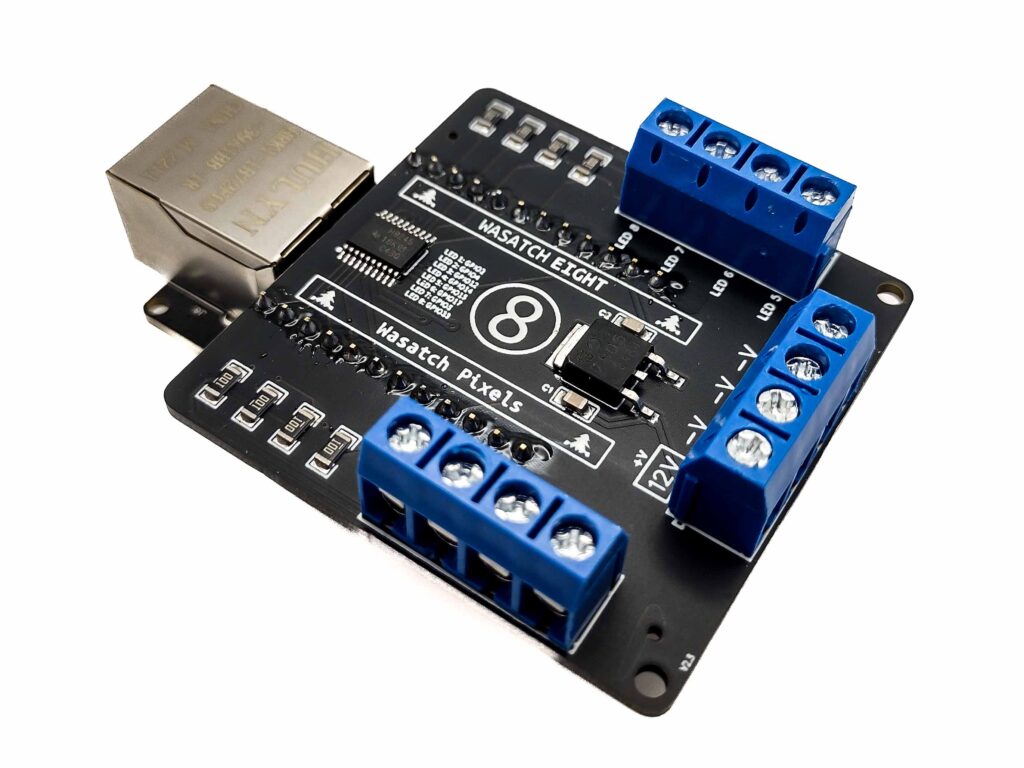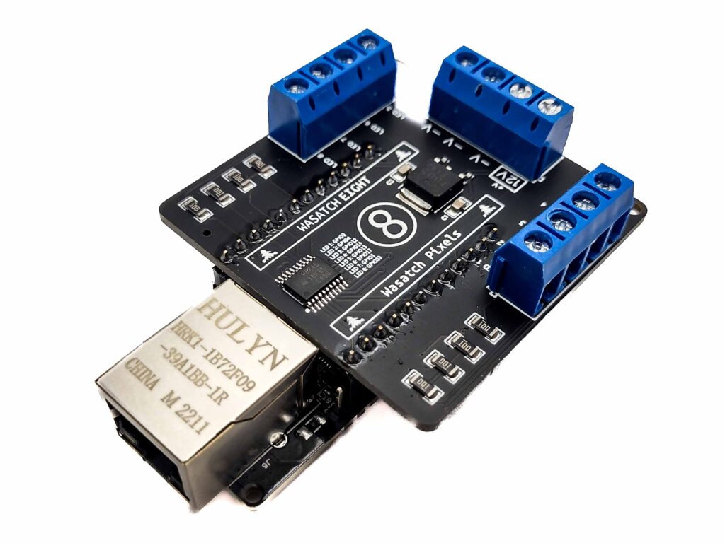 An ESP32-based Ethernet controller with level-shifting eight port HAT to control 8 LED pixel strings and/or strips