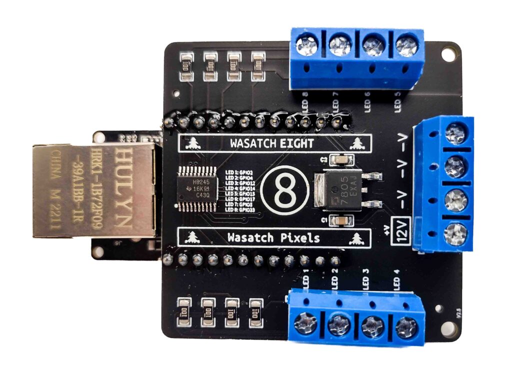 This is a board to control WS2812, WS2811, WS2815 and various other protocol LED lights. It uses an ESP32-based WT32-ETH01 board with a custom HAT that shifts the 3.3V signals from the ESP32 to 5V signals expected by strings and strips of LEDs. It comes installed with WLED software that supports both Ethernet and WiFi connectivity. This can be used to control simple animations of LED lights as well as receive E1.31 and DDP data for sequenced light shows from programs such as Vixen and xLights and Falcon Player. This board has 8 outputs to control 8 separate light strings.