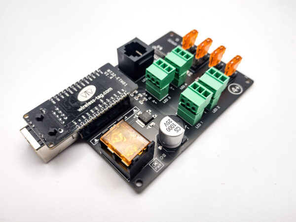 Wasatch Pixels Quad+ Controller with WLED pre-installed. Controls LEDs via iOS or Android app or in a web browser, or with xLights.